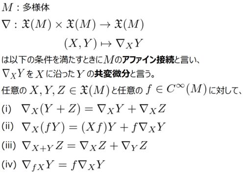 この記事では多様体上の接続と平行移動という概念について解説します。なお、この記事を理解するためには多様体、接空間、ベクトル場といった概念を理解しておく必要がありますが、それらについては以下の記事を参考にしてください。 多様体上のアファイン接…